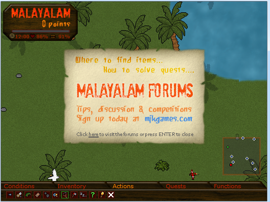 Malayalam – Island of Mysteries is a puzzle adventure, in which the player controls a character named Thomas Paine, a 34-year old fisherman, who has shipwrecked somewhere in the Eastern Indian Ocean. He drifts onto an unknown desert island named Malayalam, where the adventure takes place. The initial goal for the player is to stay alive and secure sufficient living conditions to enable further progress in the game. This involves finding food, hunting, constructing tools, building shelters, sleeping, and other everyday activities on the island. The second goal is about solving quests, which are often some sort of puzzle or riddle presented to the player in form of parchments and bottle posts. In these, the player needs to seek solutions using objects or information he has discovered on the island. The ultimate goal is to solve all missions on the island and find a way off. The game awards Malayalam Points for each day survived and for each quest solved. Players can compete with each other in an online high score table, which ranks every contender by the number of Malayalam Points earned.